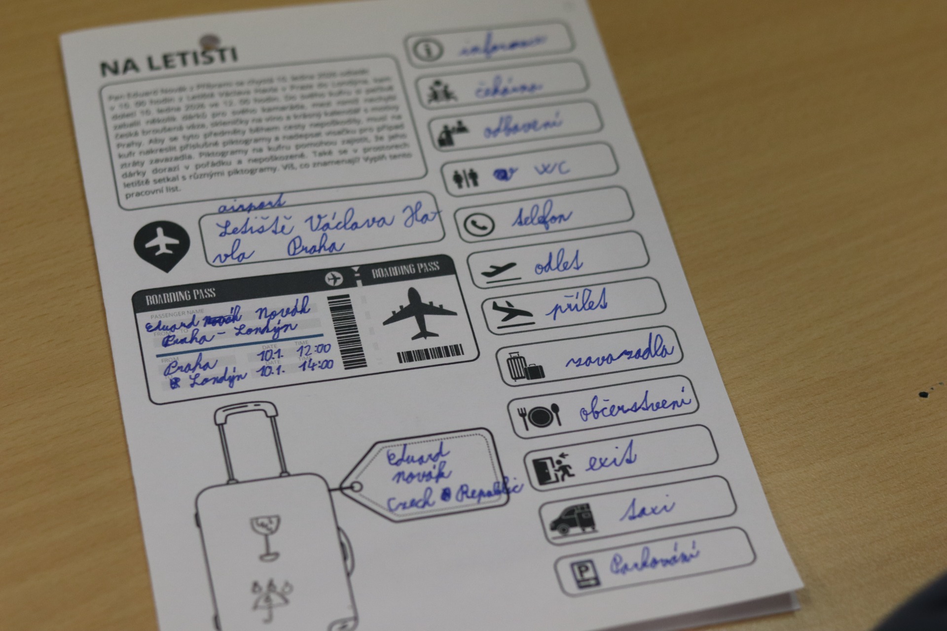 Žáci vymýšleli své vlastní piktogramy a poznávali piktogramy, které se nachází na letišti. Také navrhovali a zakreslovali vhodné piktogramy na kufr (ve kterém veze cestující z Prahy do Londýna českou broušenou vázu, skleničky na víno a fotografie Prahy), které zajistí, že tyto dárky dorazí v pořádku a nepoškozené. Při závěrečné diskuzi jsme zdůraznili důležitost používání piktogramů i z hlediska bezpečnosti, jsou to např. dopravní značky a bezpečnostní symboly na spotřebičích.