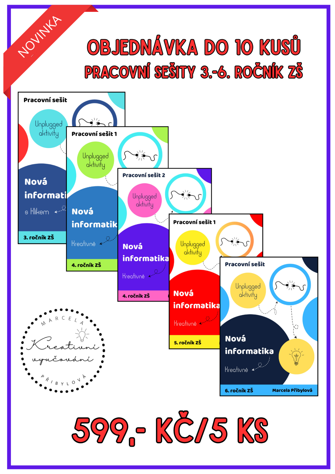 Cenově zvýhodněná sada pracovních sešitů Nová informatika pro 3.-6. ročník ZŠ. Tištěná verze, sada za 599,- Kč obsahuje 5 ks pracovních sešitů.