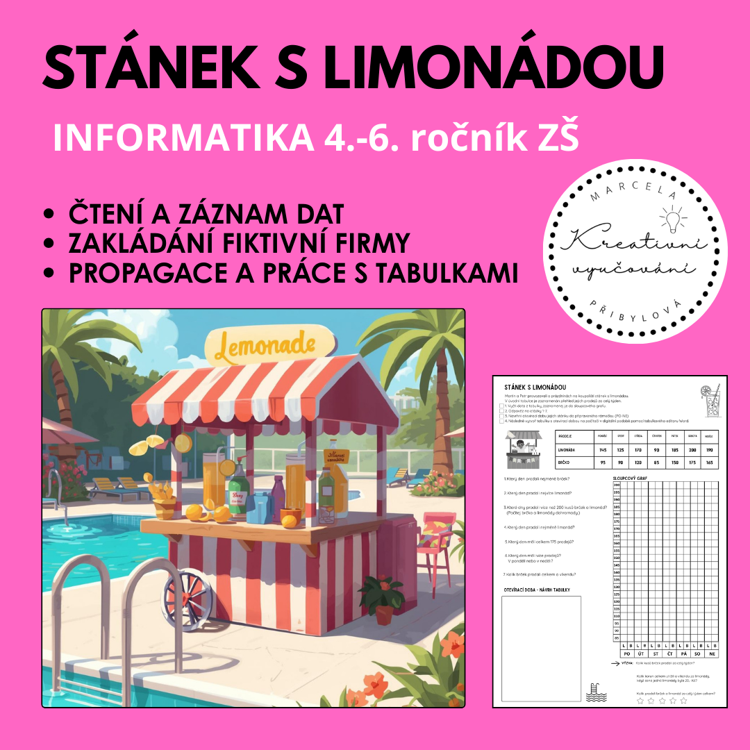 Cíl: Žáci se naučí plánovat a realizovat projekt zakládání stánku s limonádou, přičemž budou rozvíjet své dovednosti, kreativní myšlení, práci s daty a základní grafickou a tabulkovou tvorbu.