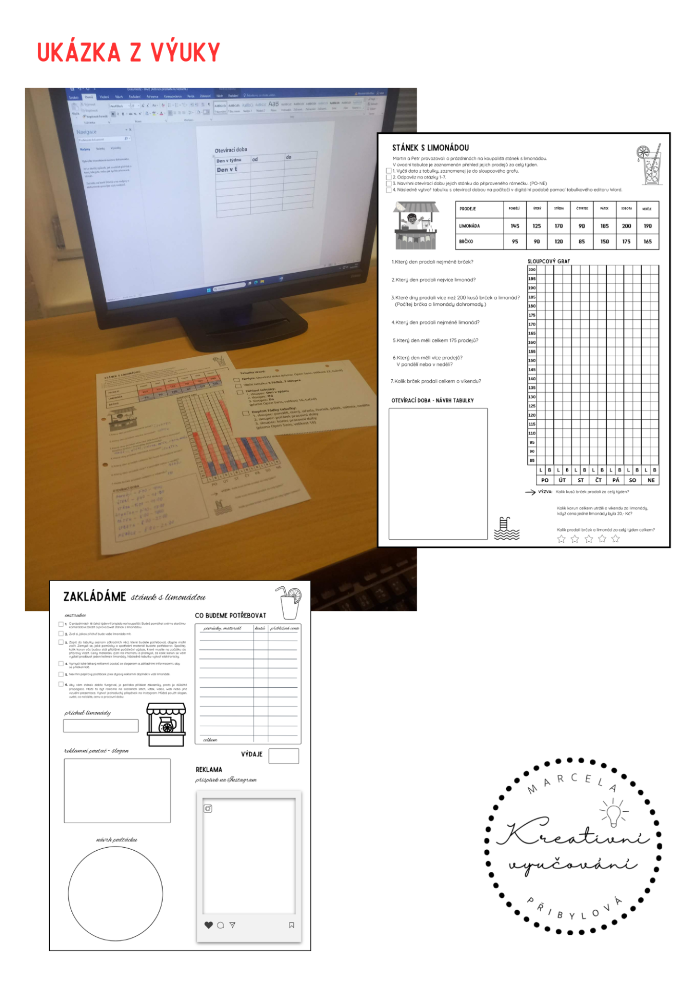Založení svého stánku, příchuť limonády, reklamní slogan, návrh stylového podtácku, příspěvek na Instagram, kombinace pracovní listy a práce na pc (Canva)